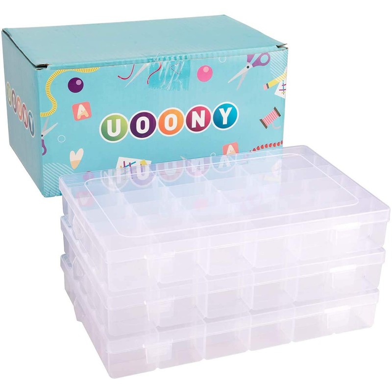 UOONY 3pack Plastic Organizer Box 36 Grids Craft Storage with Adjustable Dividers, Bead Organizer Fishing Tackles Box Crafts Thread Organizer with 400pcs Label Stickers