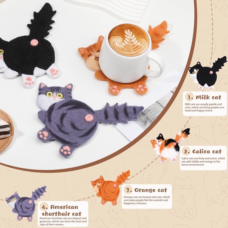 - Cat Coasters Needle Felting Kit:The needle felting set includes the amount of wool needed for the wool felting cat coasters, needle felting pad, instructions, finger cots, wooden felt handle, cat shaped cardboard.We also offer 2 models of felting needles to meet your felting needle needs