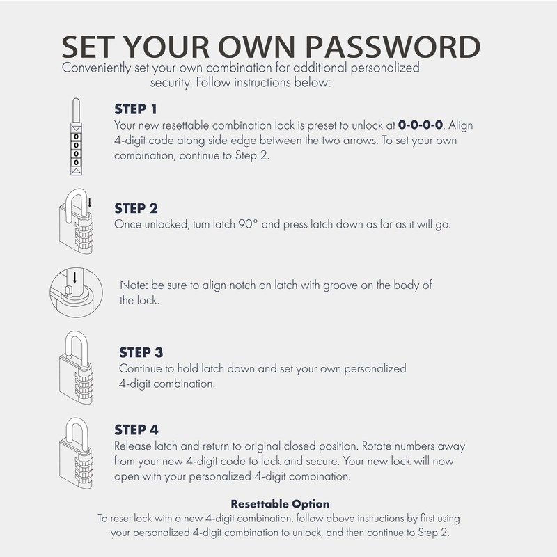 - Resettable Combination: The 4-digit combination can be easily reset to your preferred code, providing customizable security for your belongings.