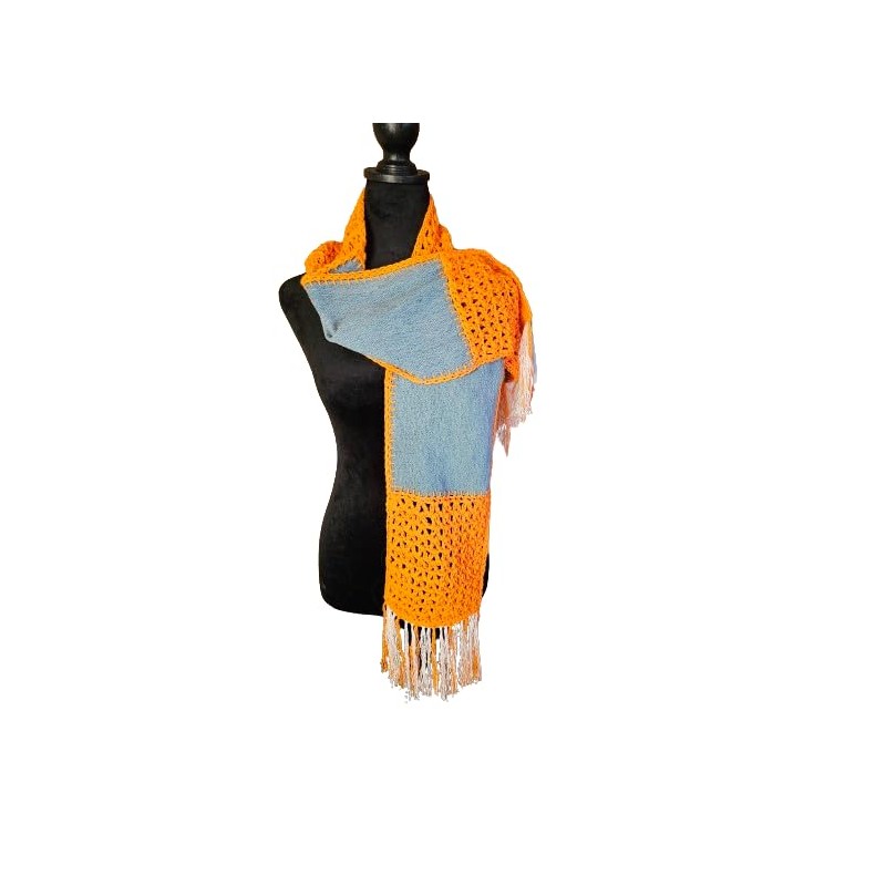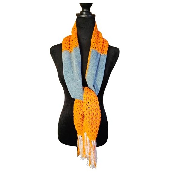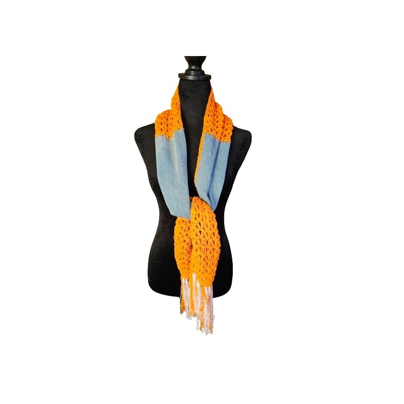 • Unique Design: This stylish scarf combines upcycled denim and crocheted orange 100% cotton yarn for an eye-catching, one-of-a-kind accessory.