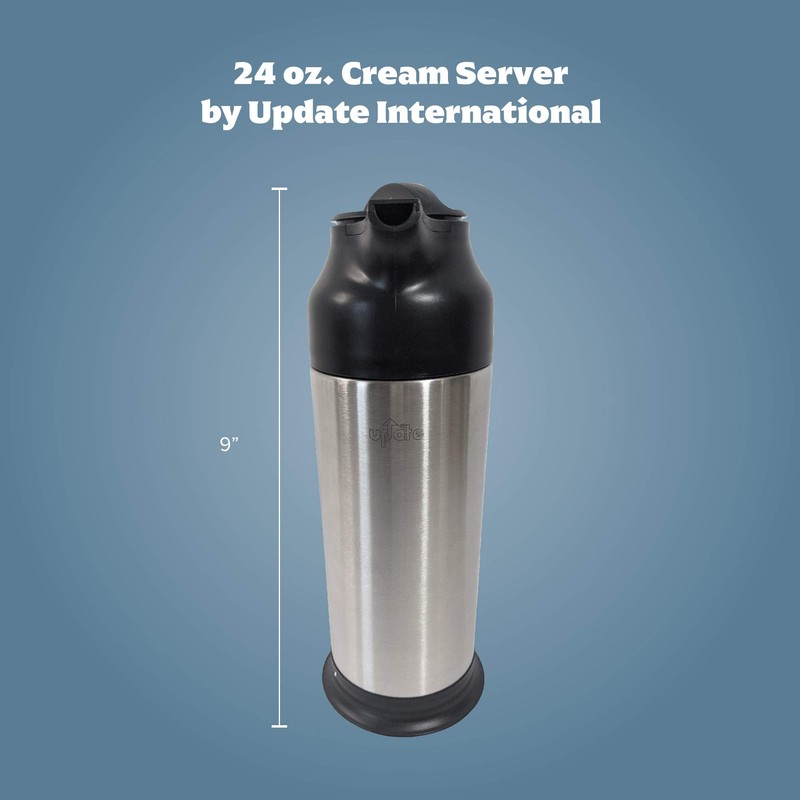 This stainless steel vacuum insulated cream server is both compact and light weight. It is easy to clean and easy to use with twist off tops that are ideal for self-serve environments. Comes in either a 24 or 33 ounce capacity.