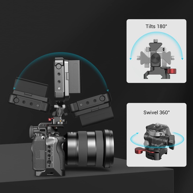 SmallRig Rotatable and Tilt Monitor Mount with NATO Clamp Mount 2906 is designed to hold your monitor for easy monitoring. It fits a standard NATO rail for quick release and comes with a top 1/4"-20 screw for monitor, microphone, light etc. The holder can be tilted 180° and swivelled 360°. Its tilt axis quickly tightens via a knob to suit different weights and features tested durability, with the tilt load capacity decreasing by no more than 20% after 10,000 inclinations, while its swivel axis is 360° adjustable via an Allen key. Bouncing positioning pins on the top help secure for Ninja V/ V+. The thumb screws have holes for Allen keys to facilitate assembly and disassembly.