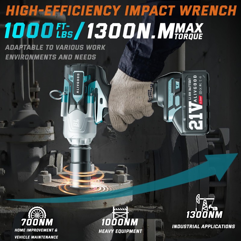 - 【Powerful Torque Performance】: The ALIVGOOD 1300N.m/1000Ft-lb electric impact wrench easily handles heavy-duty tasks such as automotive repairs, Duty Truck, RV Mower, and other high-torque applications.