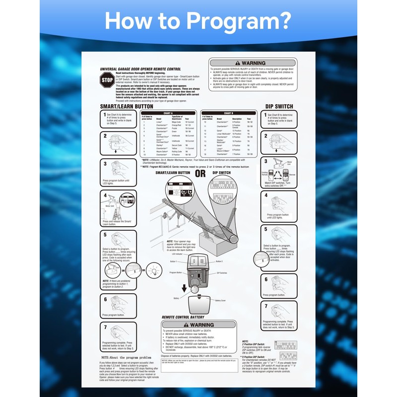 • [Flexible Programming] - 375 ut for liftmaster supports 2 programming methods, pairing via the SMART/L380ut, liftmaster 380ut remote,liftmaster 375ut remote LEARN button on the device or Matching the DIP switch settings of an existing remote/ receiver. NOTE: For different brands (e.g., Chamberlain, Genie, Linear, etc.), the remote button must be pressed a specific number of times to complete programming