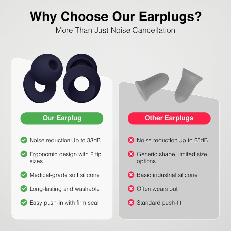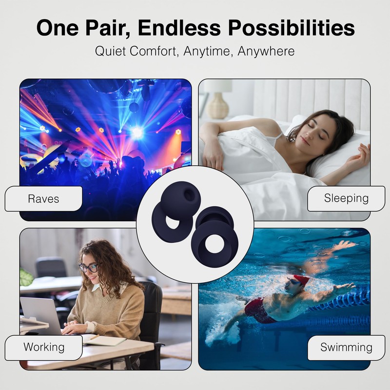 - Ultra-soft silicone earplugs in an elegant midnight blue color reduce noise by up to 49dB, providing you with peaceful, uninterrupted sleep in any environment. Whether it's city traffic, a snoring partner, or noisy neighbors, these earplugs help you rest deeply and wake up refreshed.