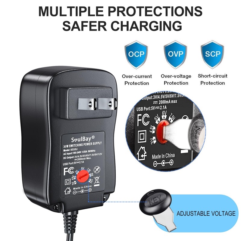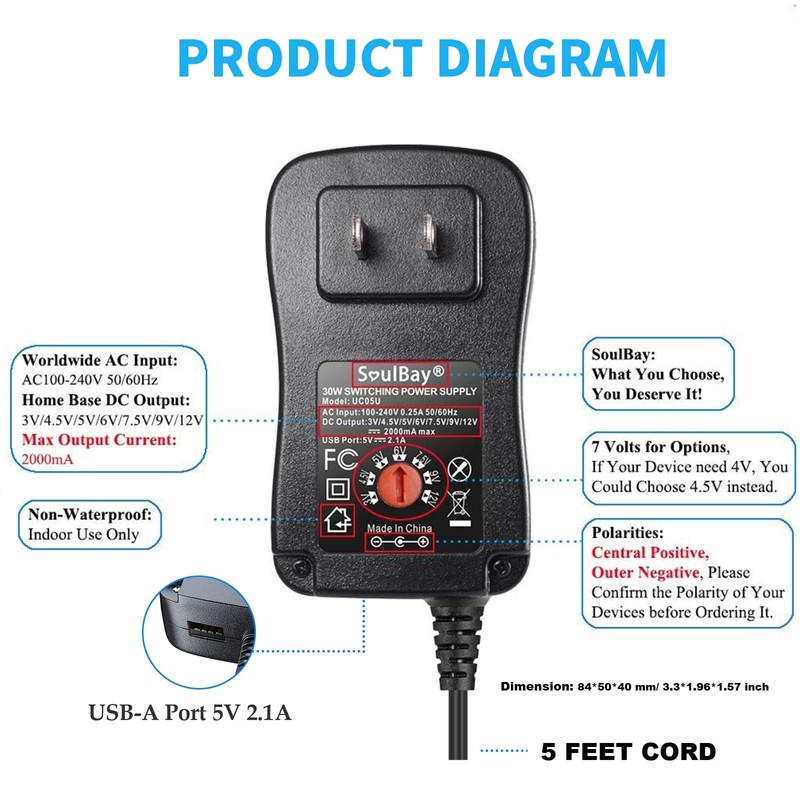 - ✅ SAFE AC/DC ADAPTER: Input: AC100-240V 50/60Hz, Output: DC 3V/ 4.5V/ 5V/ 6V/ 7.5V/ 9V/ 12V 0-2A, USB Port: 5V 1.2A, Cord: 5 FT. Smart chip with built-in advanced safety technology, with comprehensive protection against overvoltage/overcurrent/short circuit/overtemperature
