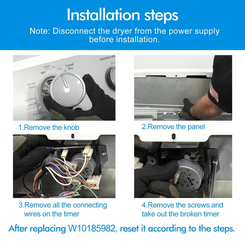 - 【Easy installation】 The W10185982 dryer timer knob is very easy to install, taking only ten minutes without hiring a mechanic, saving maintenance costs. Please turn off the dryer power and unplug the plug before installation to ensure safe operation.
