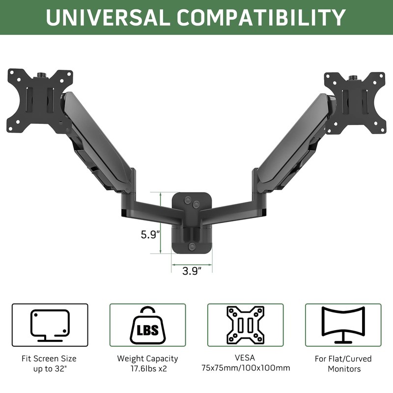 • UNIVERSAL COMPATIBILITY - The dual monitor wall mount perfectly fits most of LCD LED flat screens and computer monitors up to 32 inches and 17.6 lbs, compatible with VESA patterns of 75x75mm and 100x100mm.