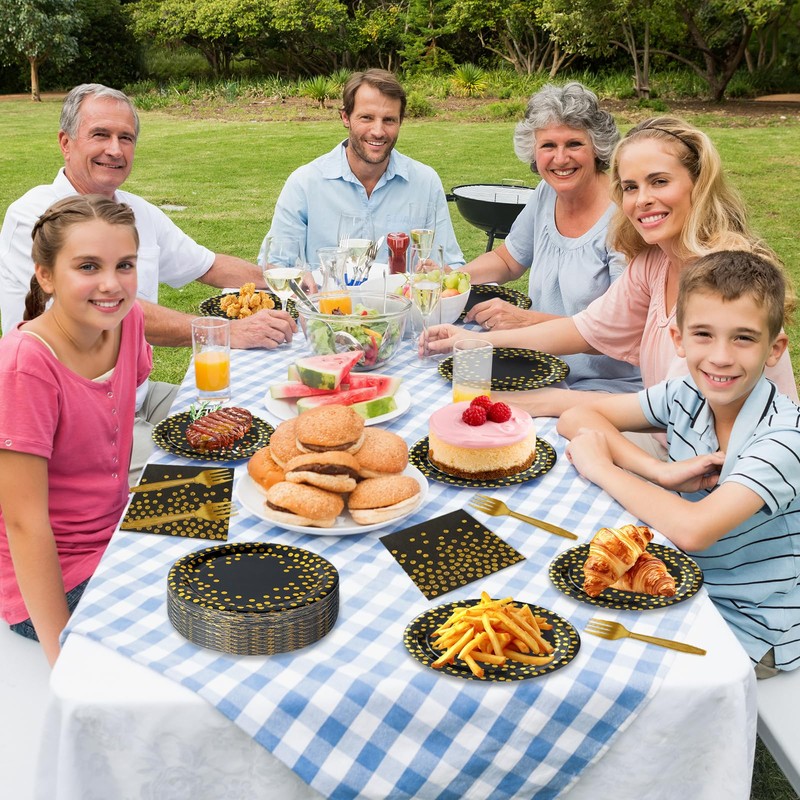- Easy to Use: Black and gold disposable tableware saves you the trouble of cleaning up spills and washing up at the party. Our party supplies come with everything you need, making it easy for you to enjoy more time with family and friends.