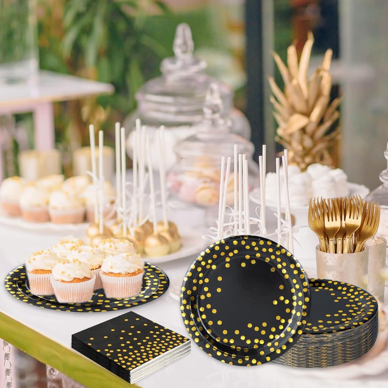 - Polka Dot Design:Black and gold paper plates and napkins party supplies using gold foil polka dot design, beautifully printed and colorful.Lightweight black and gold paper plates suitable for indoor activities,decorating your table with this black and gold party tableware will be a great choice.