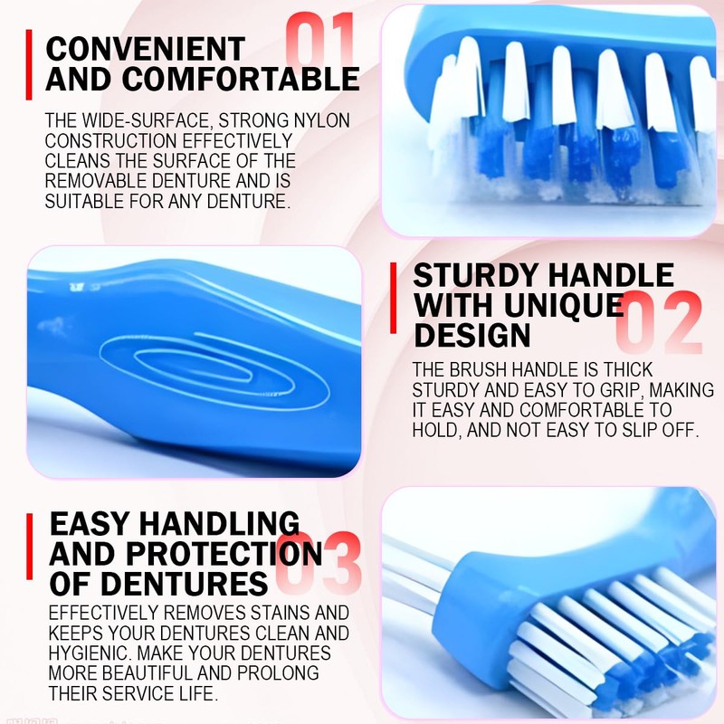 - Function:Denture toothbrush can effectively clean food debris, hygienic care, fresh breath, keep your mouth clean and healthy, prevent dental caries and oral problems. It also extends the service livelihood of dentures.