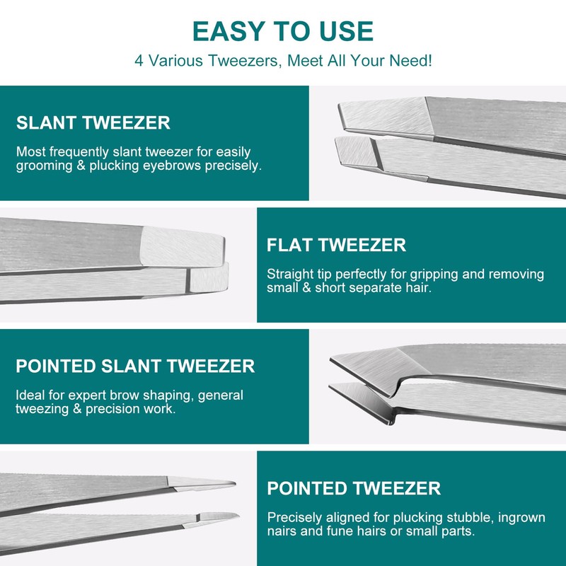 - ❤ 4 PRAKTISCHE PINZETTEN - Verschiedene Formen der Spitze enthalten: flach / gerade, schräg und spitz; Präzisionspinzetten mit verschiedenen Spitzen entfernen Haare aus verschiedenen Teilen des Körpers, die Ihre Vielzahl von Bedürfnissen erfüllen können.