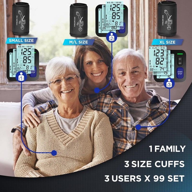 Upper Arm Blood Pressure Machine - 3 Size Cuffs, Small 7"-9", Medium 9"-17" and Extra Large XL 13"-21" for Big Arms, Accurate Automatic Digital BP Machine for Home Use, Large Display, 3 Users