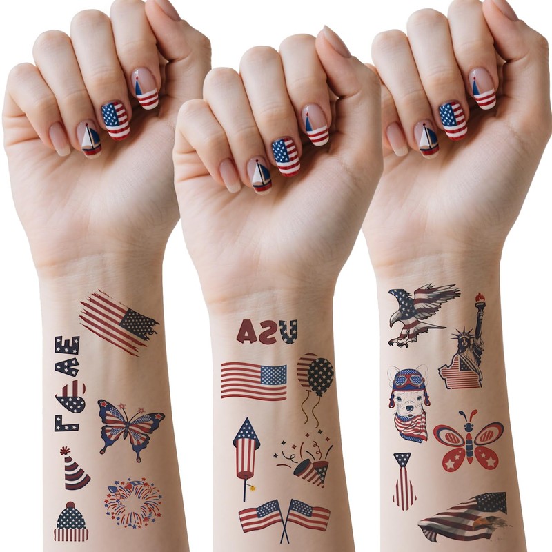 - Sparkling Patriotic Set - This dazzling set includes a sequin-beaded headband, a matching pair of American flag earrings, a red white and blue necklace, and three temporary tattoos for a complete 4th of July look.