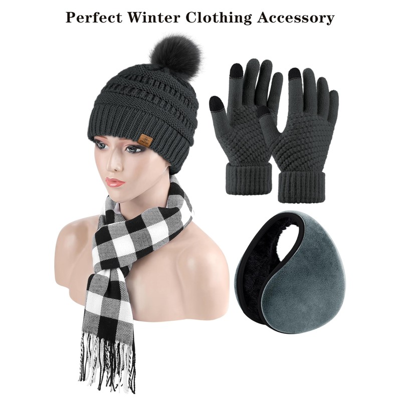 - 4 in1 winter set: you will receive 1 piece of beanie hat with fur balls, 1 piece of plaid scarf, 1 pair of touch screen gloves, and 1 piece of ear warmer, the complete winter wearing set is necessary for you to spend cold days of winter, can protect your hands, neck, chin, ears, and head