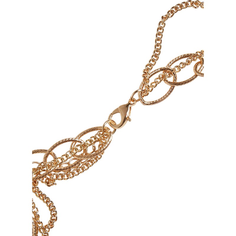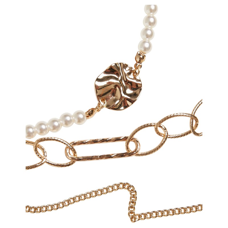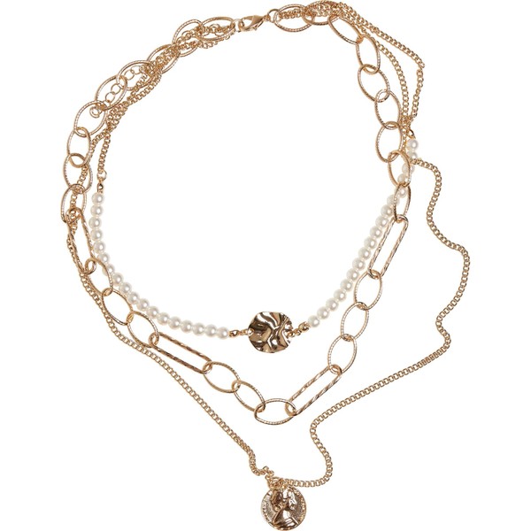 - With bold style, this three-row jewellery necklace enhances any urban outfit. The fine outer row bears a round amulet with a portrait in profile. The middle row impresses with its large round and elongated links. The inner row of the jewellery consists of beads and a wave shaped amulet. The Urban Classics accessory is made of iron, a zinc alloy and ABS.