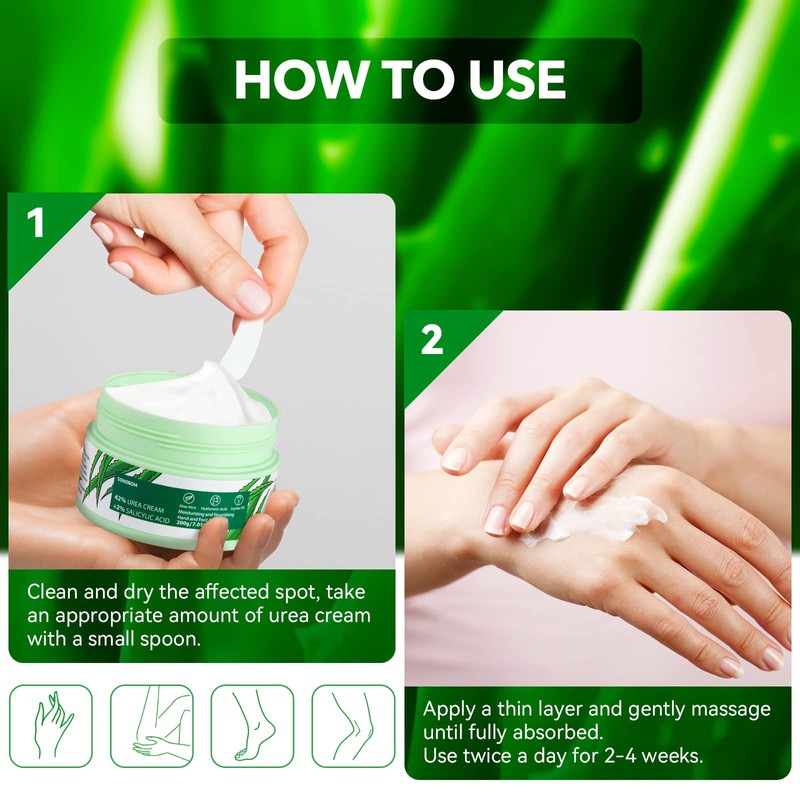 - 【A Complete Treatment】 Our urea cream contains 42% urea at maximum strength, aloe vera and jojoba oil to moisturise the skin. Hyaluronic acid has powerful moisturising properties. 2% salicylic acid enhances the ability to exfoliate. It is a complete treatment for calluses, dry, cracked, rough, scaly hand and foot skin conditions, desinged to soften and moisturize skin.