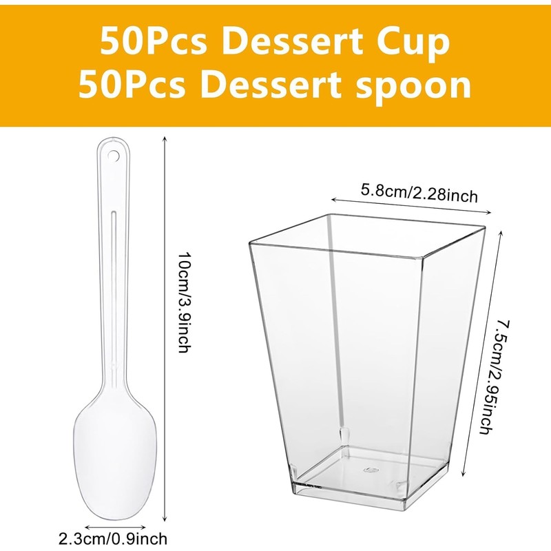 - 【Plastic Dessert Cups Set】Completed with 50-pack of 160/240ml square plastic dessert cups and 50-pcs disposal spoons, small dessert cups are perfect choice for party, events, restaurants, retail, small business, homemade dessert and more.