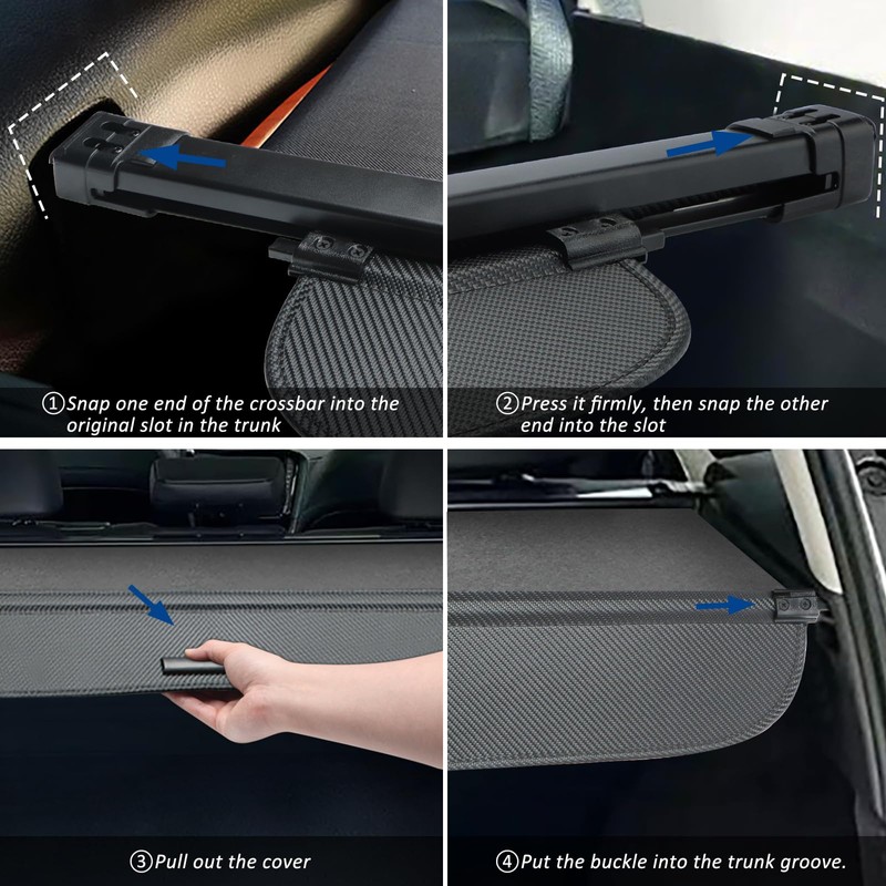 - ✔ [Easy to Install] No tools needed.No damage to your car. Simply insert the bar into the groove before pulling out the cargo cover, and then snap in the buckles on both sides to secure the cargo cover in place. Feel free to contact us if there is any problem any time.