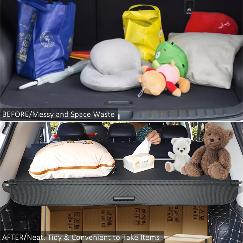 - ✔[Convenient to Pick Items] The security cover rationally optimizes the space to the upper and lower layers, helping you very convenient and fast to pick the items in the rear trunk. The shield is designed to connect with the rear seat closely, never worry about the item falling down between the gap.
