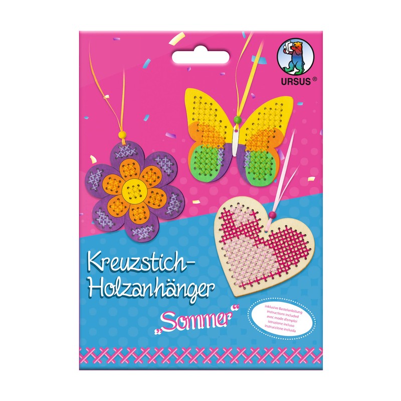 Ursus 21440002 Wooden Cross Stitch Pendant "Summer", Craft Set for Children with 3 Wooden Pendants, Embroidery Thread, Embroidery Needles, Decorative Material and Instructions (English language not
