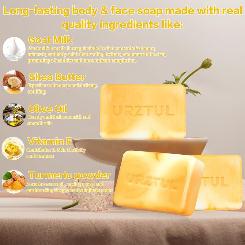 - EASY TO USE: URZTUL 3 packs turmeric goats milk moisturizing soap with free bubble net. And easy to use, you can put the tumeric goats milk bar soap into the foaming net, wet with water and rub to foam before applying on your face or body