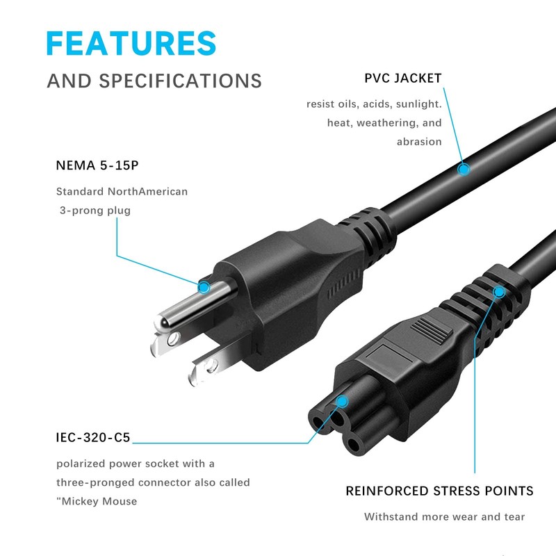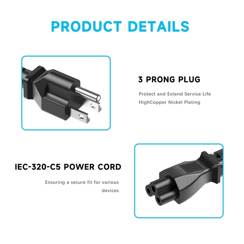 - Compatibility: This 3-prong AC power cable is designed for use with laptops, notebooks, and other electronic devices requiring a standard US power connection.