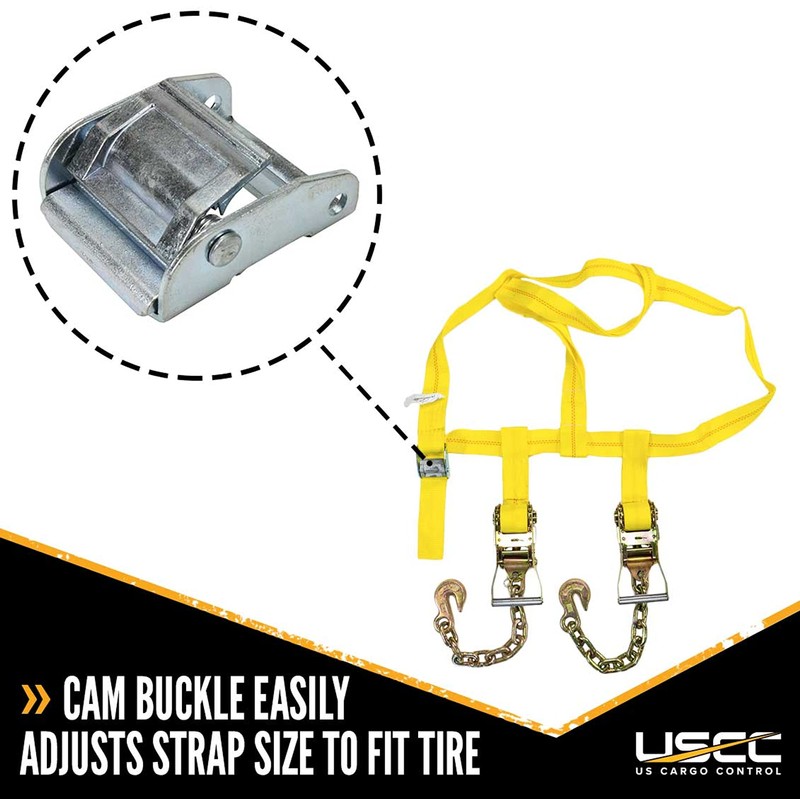 • PROFESSIONAL GRADE TIRE TIE DOWN STRAPS - US Cargo Control side mount tire straps are used by professionals and recreational car haulers alike to safely and securely tie down their vehicles for transit on a flatbed truck or trailer.