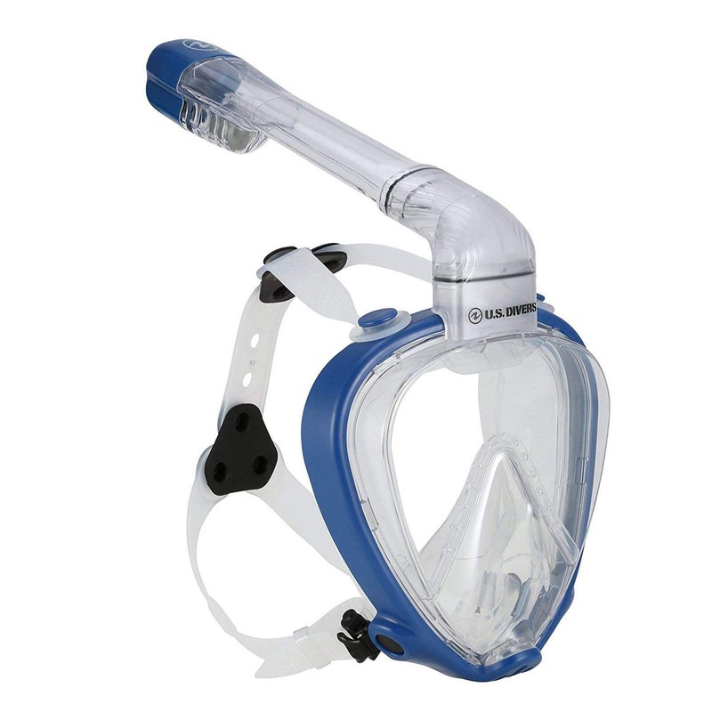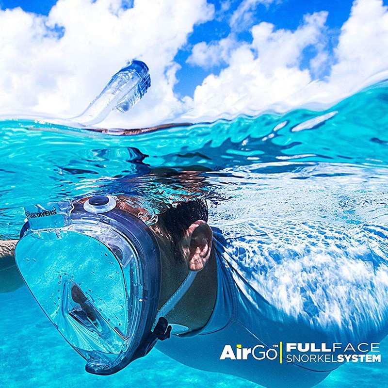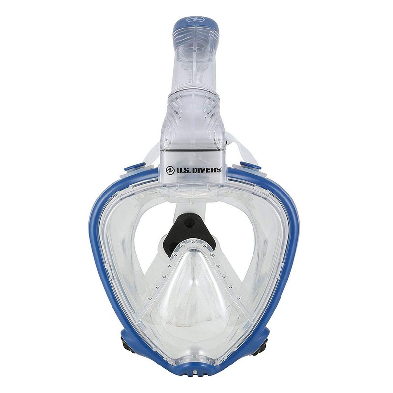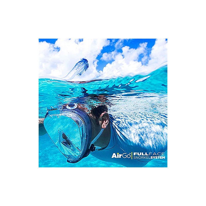 US Divers AirGo Full Face Snorkel Mask Systems. Available in 2 sizes M and L/XL. If you measure the top of your nose to the bottom of your chin M is between 4.7-5.1" and L/XL is 5.1+" Breathe comfortably, naturally and safely underwater with AirGo, US Divers' full face snorkeling mask. When you choose U.S. Divers products, you get equipment that is backed by 75 years of design and manufacturing expertise that has made us the number one global leader in diving and snorkeling gear. Designed with comfort, safety, and quality in mind, the AirGo Full Face snorkel mask is easy to adjust for the best, most comfortable fit. It has a one-way purge valve to make it easy to clear, and since it has no mouthpiece, you don't have to deal with jaw fatigue. The AirGo Full Face snorkel mask is full of user-friendly features that are easy-to-use and help solve common snorkeling challenges. The High-Tech 1 window system allows 180-degree panoramic visibility and the unique fog-free design lets you enjoy what's beyond your mask and not be annoyed by what's happening in it. Ergonomically designed equipment made with premium, hypoallergenic, soft silicone and dual-material construction the AirGo gives a secure, customizable fit. • 180° Panoramic Visibility - The AirGo Full Face Snorkel Mask allows 180 degree panoramic visibility and the unique fog-free design allowing you to see and breathe underwater as you do on land. • Easy Breathing - Best in class breathability comes from the AirGo's unique dual chamber system that separates inhaled fresh air from exhaled CO2 (carbon dioxide), ensuring that you don't rebreathe your own exhaled CO2, and are only breathing the fresh air around you. • Dry-top - 100% Submersible dry-top keeps the water out of the snorkel tube above and below the surface. • Fog Free - The unique fog-free design prevents buildup of condensation letting you enjoy what's beyond your mask and not be annoyed by what's happening inside.