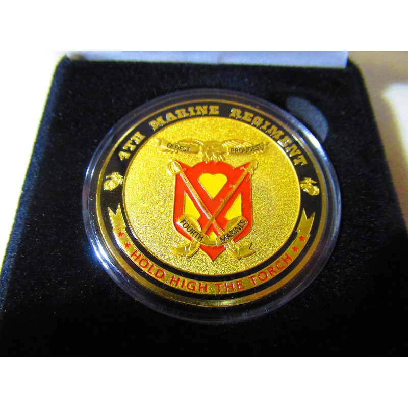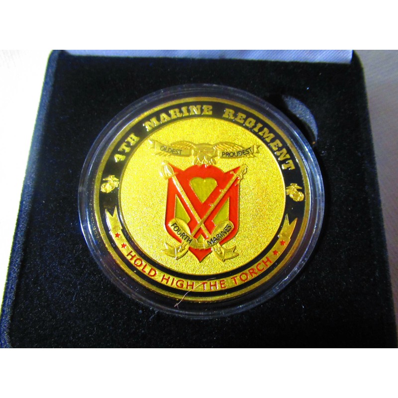 This is a great looking 4th Marine Regiment commemorative challenge coin. Coin is about 1 9/16" in diameter. This coin has a 4th Marine Regiment insignia on front in raised lettering and the Marine Corps logo on the reverse. Coin is contained in an acrylic air tight holder and is displayed in an attractive black velvet presentation box which will make this a very impressive gift.