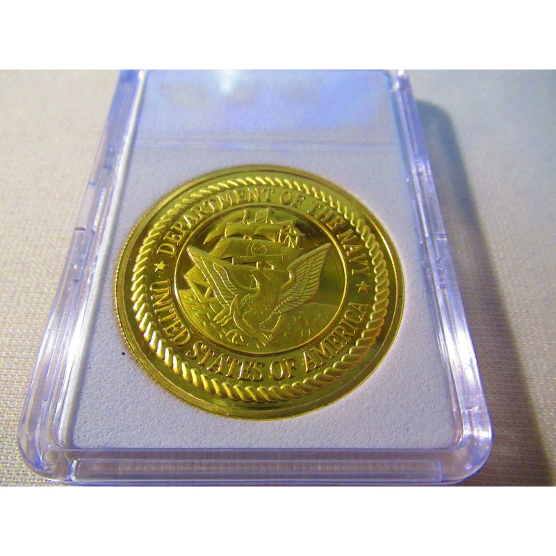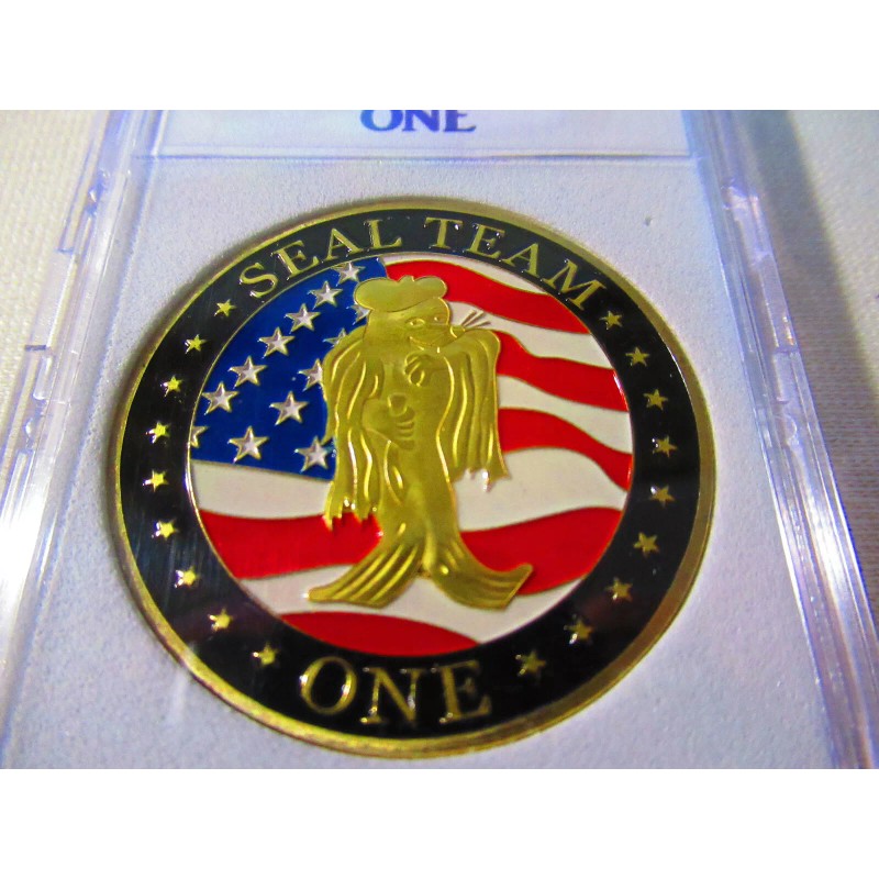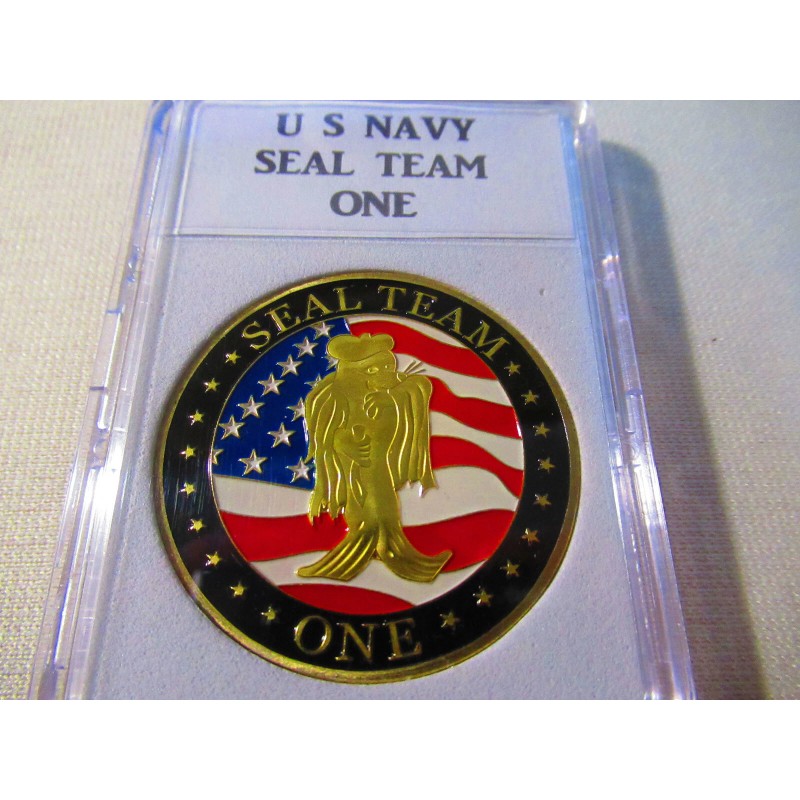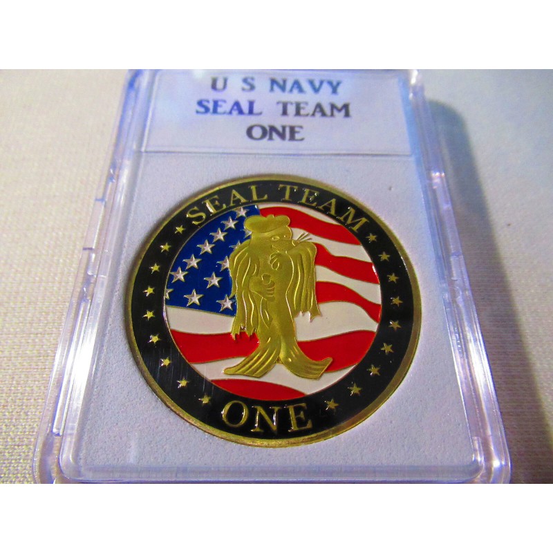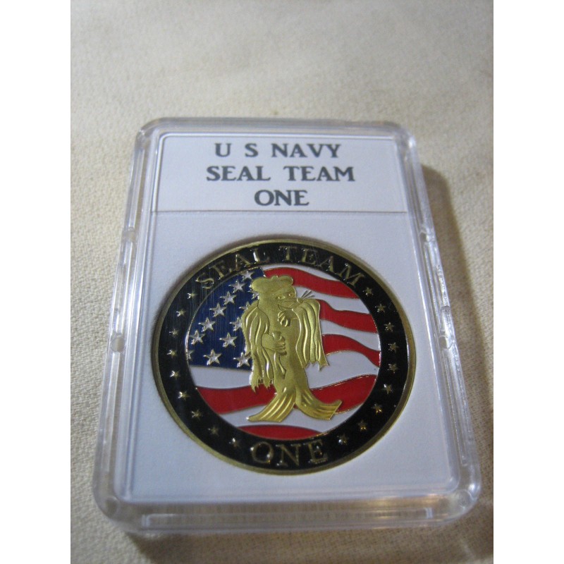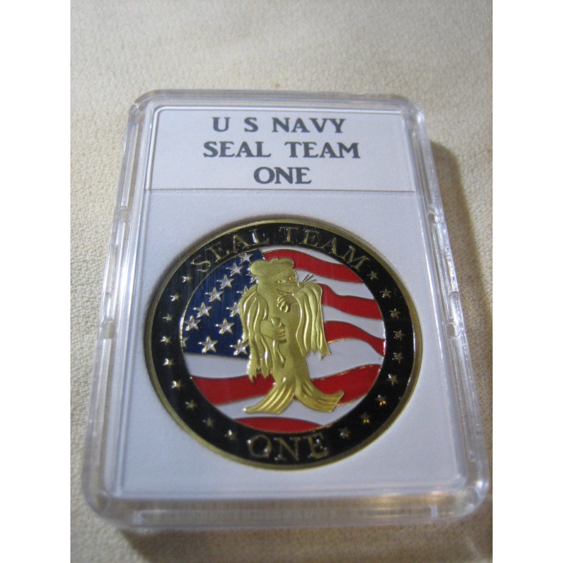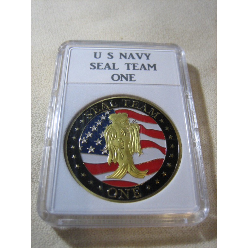 This is a great looking US Navy Seal Team One challenge coin. Coin has reeded edges and is about 1 9/16" in diameter. All details are raised lettering and gold plated. Coin is contained in an acrylic air tight holder.