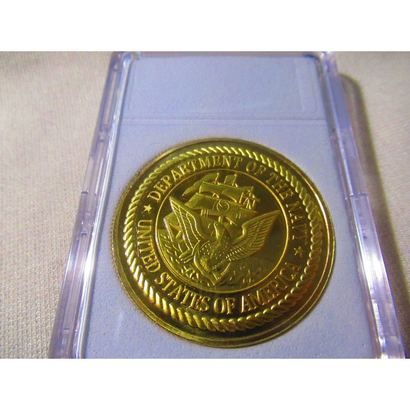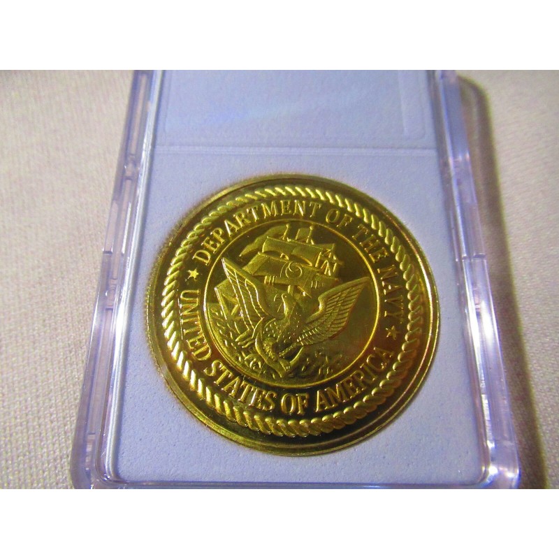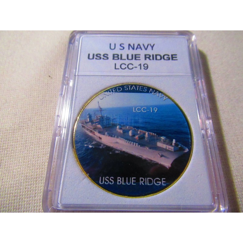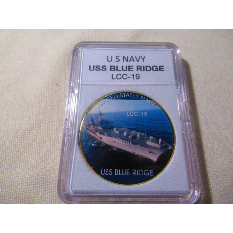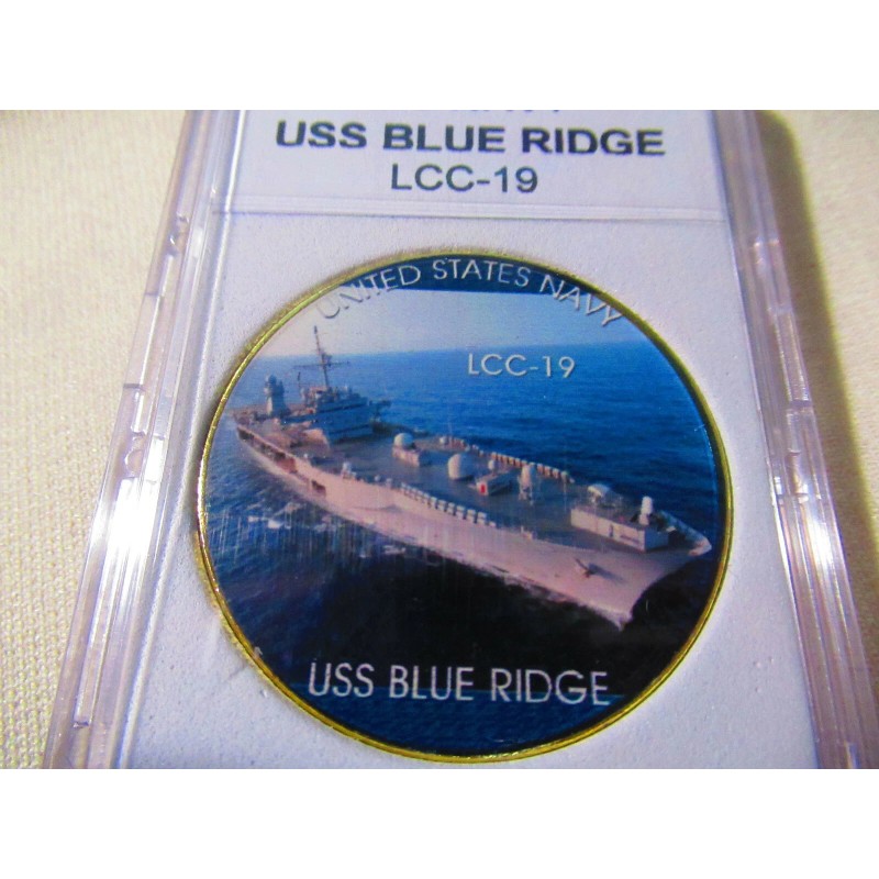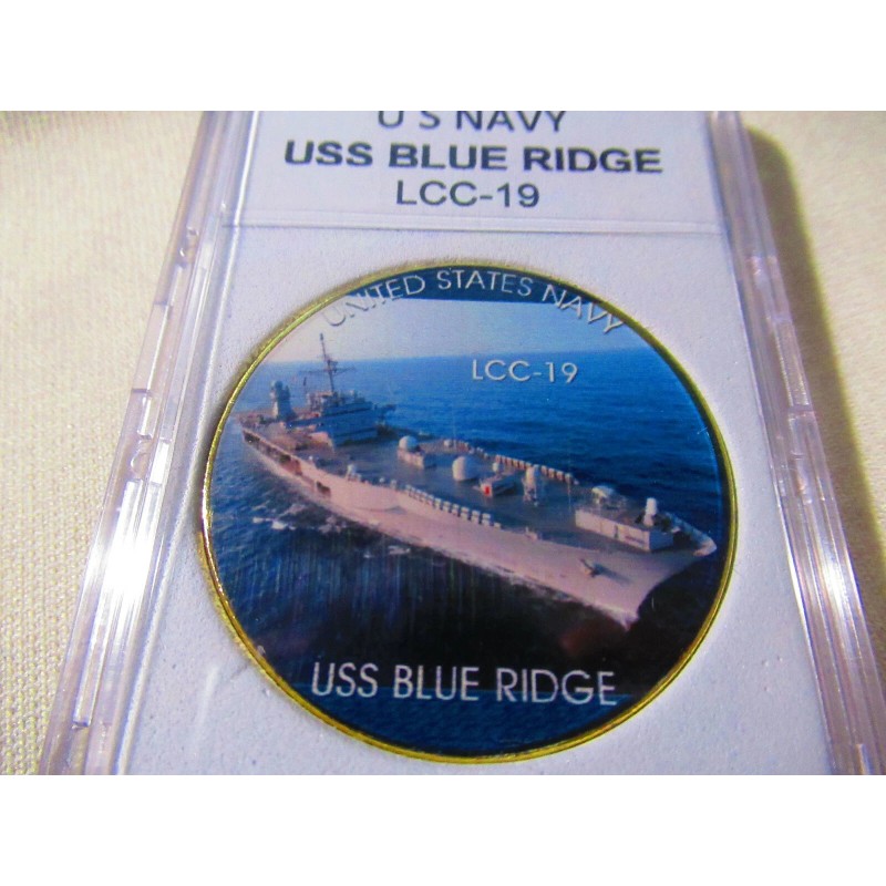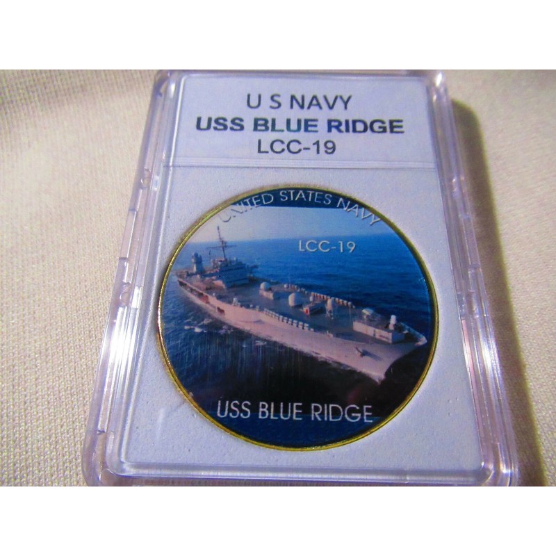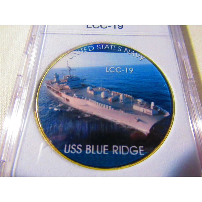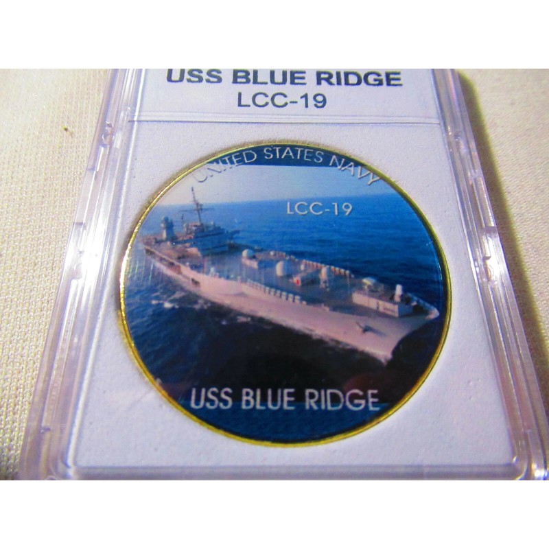 This is a great looking US NAVY - USS USS Blue Ridge (LCC-19) challenge coin. Coin has reeded edges and is about 1 9/16" in diameter. Front side of coin is printed and colorized while the rear side is raised lettering and gold plated. Coin is contained in an acrylic air tight holder.