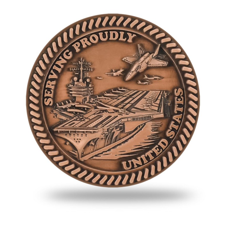 - Detailed Craftsmanship: The reverse side showcases an intricately engraved aircraft carrier and fighter jets, representing the power and dedication of the Navy, ideal for collectors and military enthusiasts.