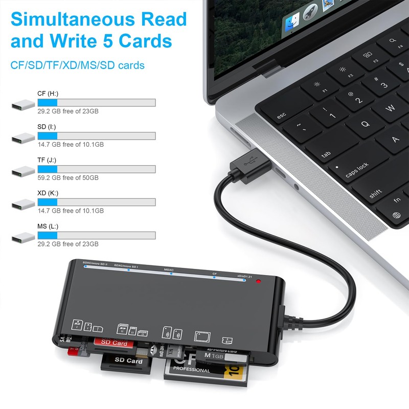 - Extensive Compatibility: Supports CF, high-speed CF (UDMA), SD, SDXC (up to 2 TB), SDHC, micro SD, micro SDXC, micro SDHC, TF, MS, and XD memory cards; expands connectivity options