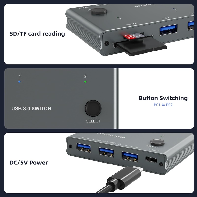 - Super Speed Data Transfer: This USB 3.0 data hub performs faster and supports transferring large amounts of data in seconds, with high speed data transfer up to 5 Gbps.It is not only a USB Switches, but also a portable SD/Micro SD carder reader. With this adapter, you can easily access files on general-purpose SD and Micro SD memory cards (located in cell phones/cameras, etc.). Cost-effective by eliminating the need to install another card reader. Saves time and does not lose connections.
