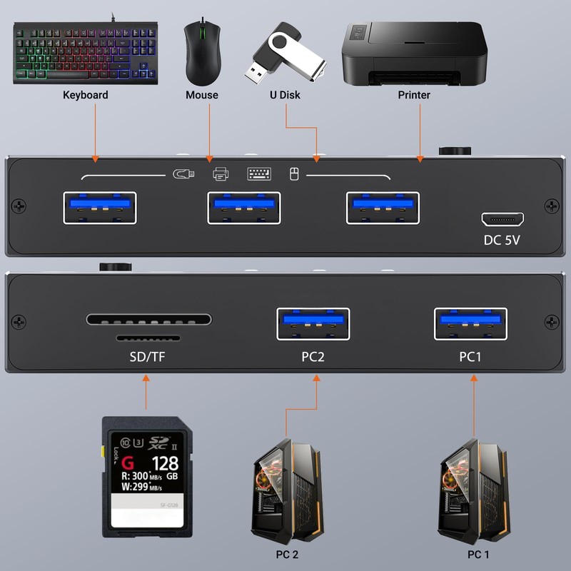 - Share Multiple TF/USB Devices between 2 Computer : The NAWEN 2 in 4 out USB 3.0 KM switch supports 2 computers share 3 USB devices and TF card like keyboards, mouses, U disk, printers, scanners, USB cameras, headphones, etc. It's convenient for you to switch freely between your work computer and personal computer, driver free and compatible with multiple OS, such as windows 7/10/8/8.1/7/Vista/XP and Mac OS, Linux, and Chrome OS.【Note】 The TF card follows the USB output together work.