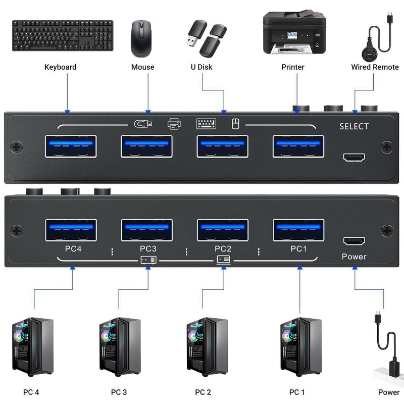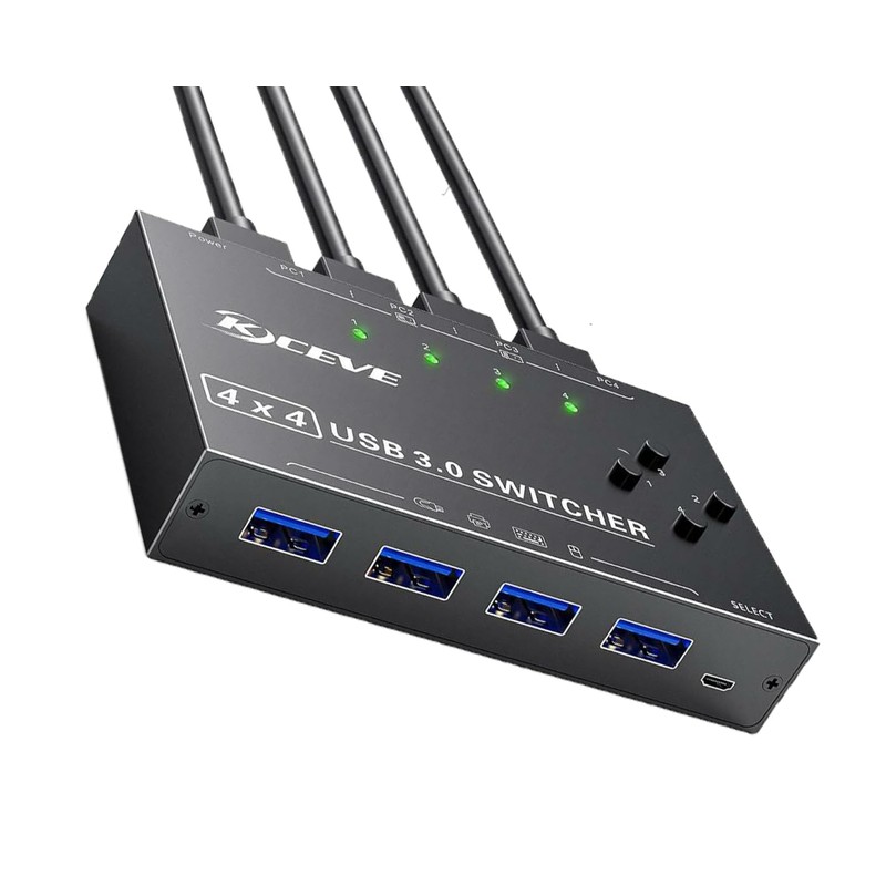 • 【Easy to switch 4 computers】One button swapping between 4 computers to share 4 USB peripheral devices without constantly swapping cables or set up complicated network sharing software. You can press the button on the panel or use the wired remote(included) to switch four computers. The blue LED light on the USB 3.0 switch will indicates the active computer.