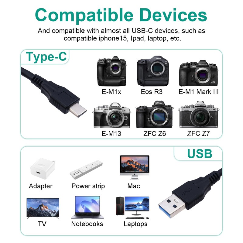 - 【Universal Compatibility】Replacement Compatible with Canon EOS RP, EOS R, R5, R6, EOS R8 Camera, Nikon ZFC Z6 Z7 D6 D780 Camera, Olympus E-M1 Mark III Mark Ⅱ Camera.This USB cable is suitable for synchronizing your camera with your computer to view images or transfer data on your computer.