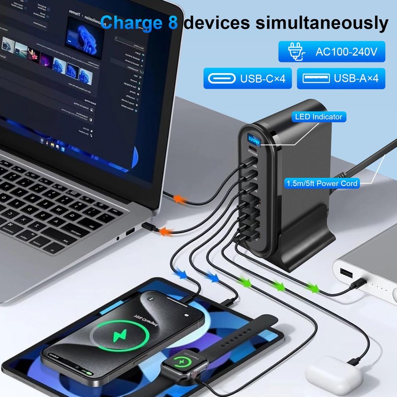 - USB C charger, 320 W fast charger, 9 port charging station GaN III Tech power supply quick charger