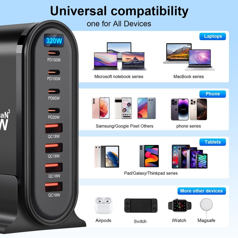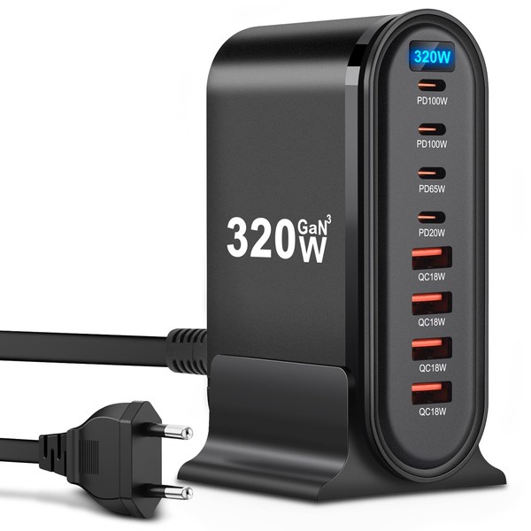 USB C Charger, 320 W Fast Charger, 9 Port Charging Station GaN III Tech Power Supply Fast Charger
