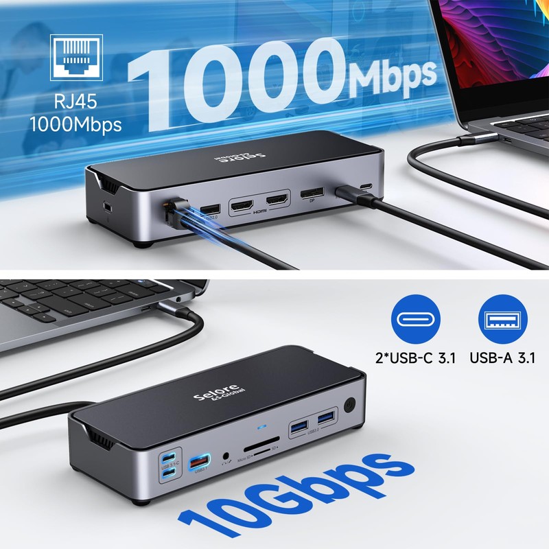 - 15 in 1 USB C docking station: with this USB C dock, you can easily extend your laptop from a USB C port to 15 ports. This docking station with three displays is equipped with two HDMI ports, DP, an integrated security slot, 2USB 3.1 C, 1 USB 3.1 A, 2 USB 3.0 and 1 USB 2.0, 1000Mbps Ethernet network, 100W PD USB C port, SD/TF card reader, 3.5 mm audio/microphone port. Note: The safety cable is not included.