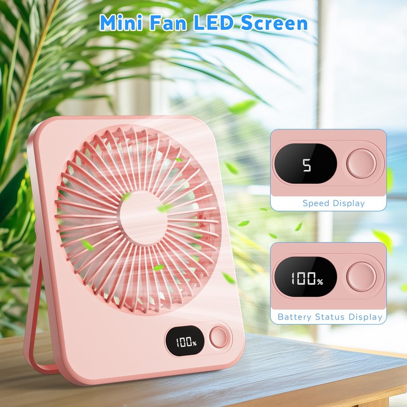 USB Desk Fan, Portable 2000mAh Rechargeable Table Fan, 5 Speeds, LED Display, 4-10H Quiet Runtime, 180° Adjustable Mini Desktop fan for Office, Bedroom, Home, Travel(Pink)