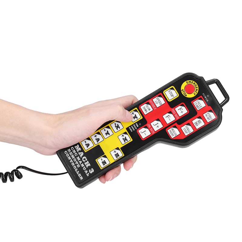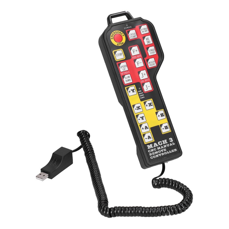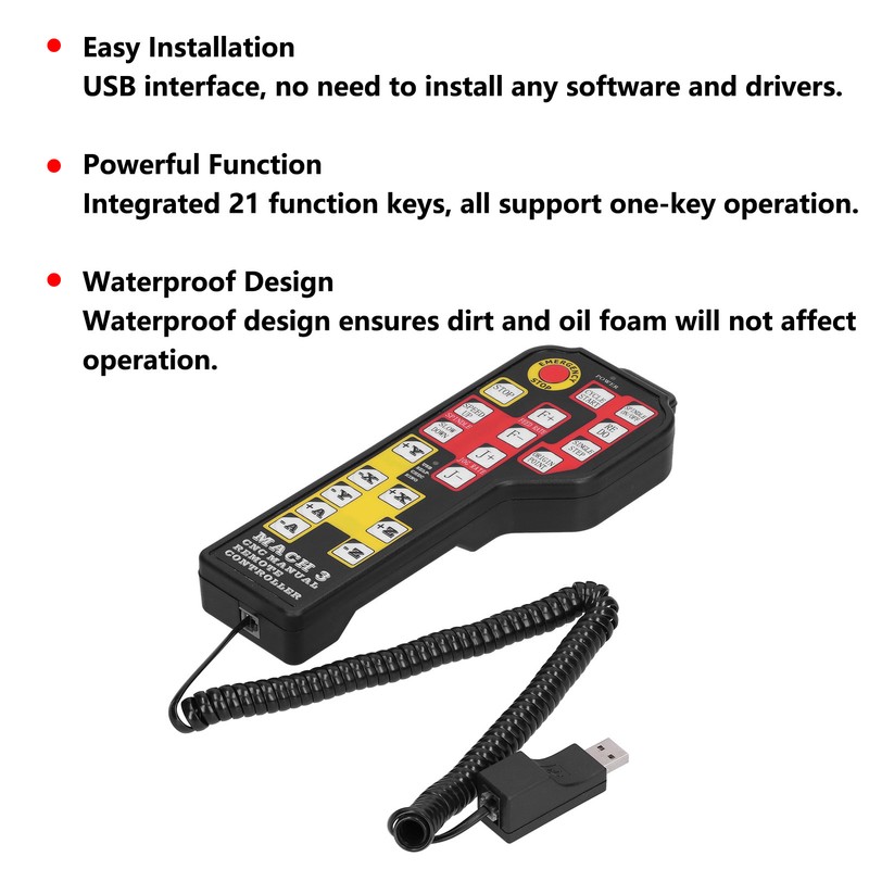 1、There is no need for installing any software and drivers, and the USB port adds more convenience to the control. 2、The spring wire can be stretched to a maximum length up to about 3 meters, ensuring a safe remote operation. 3、Has 21 function keys, including emergency stop, run, spindle open and close, redo, stop, and so on. 4、Adopting a waterproof design, which can guarantee that the dirt and oil will not affect the stable working. 5、Large button enables a clear view and more convenient operating without mistouching other buttons.
