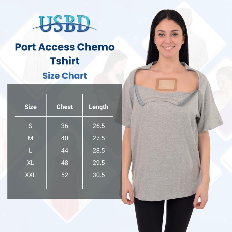 - OUR PORT ACCESS CHEMO TSHIRT- ensures functionality and style without compromising dignity and comfort. The shirt is easy and accessible for patients to use during and post-chemo discomfort. The zippers are easy to undo which ensures no disturbance or discomfort for the patients, and is accessible to every area of the upper body.