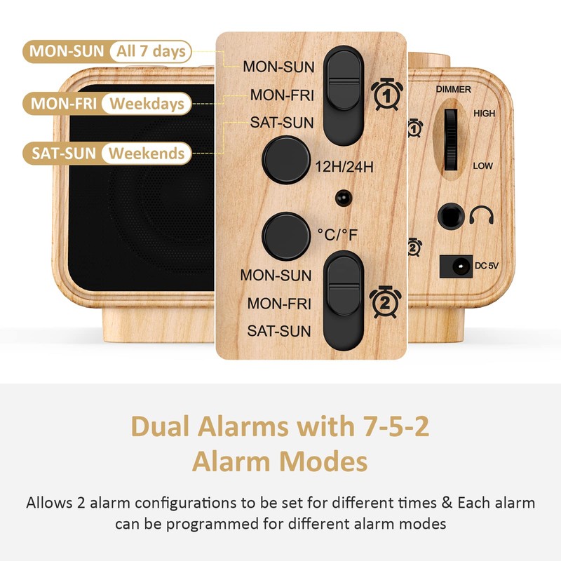 - CUSTOMIZABLE ALARM - Dual alarms with separate weekend/weekday/all-7-day mode satisfy the needs of everyone and every family. You may choose one of the 5 built-in tones (Beep/Piano/Buzzer/Bird/Soft Music) or radio as wake up sound, which gradually increases in volume from gentle to the level you set (options from level 1 to 15). Snooze allows extra 9 minutes of slumber.