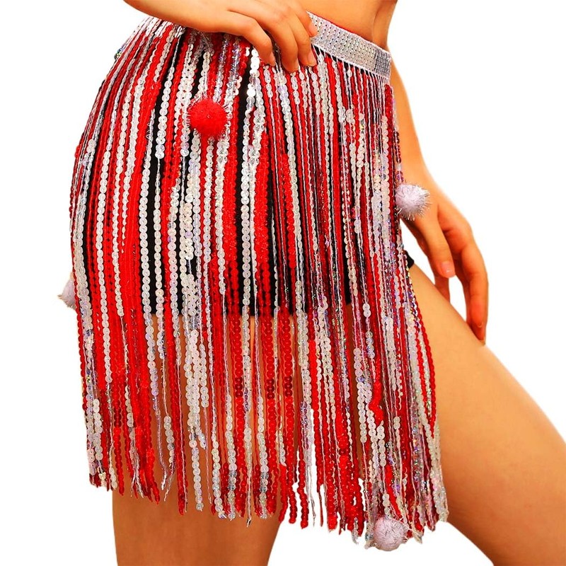 Ushiny Christmas Sequin Skirt Red Tassel Skirts Xmas Rave Festival Outfit for Women, red