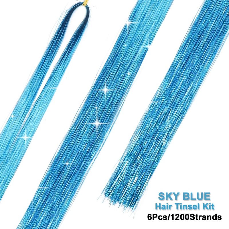 - Hair Tinsel Kit with Tools: You will get 6pcs/1200 strands of hair tinsel extensions in sky blue colors and hair accessories, including 1 crochet hook and 3 packs of micro silicone link rings beads (black, blonde and brown).