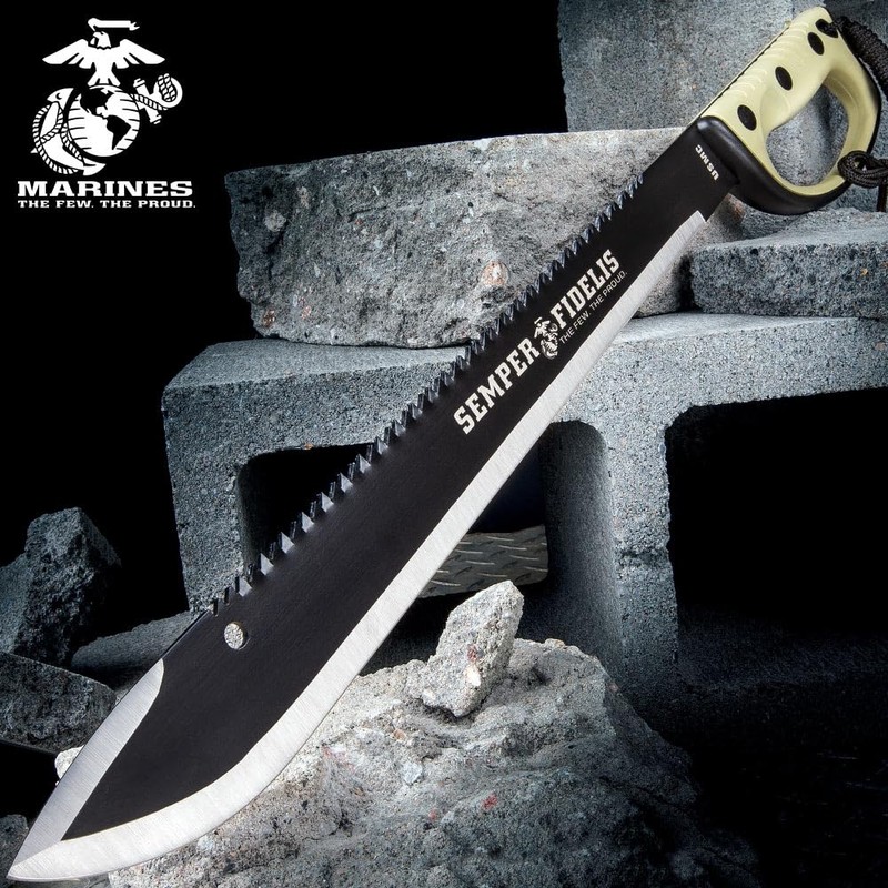 United Cutlery USMC Semper Fi Sawback Machete Knife with Sheath | Full-Tang Machete | 17 1/2" Non-Reflective Stainless Steel Blade | Saber-Style Handguard Handle | Modern Tactical Weapon - 24” Overall