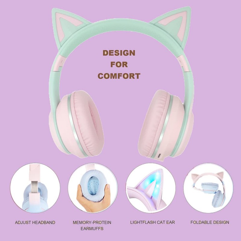 - 【ADORABLE CAT EAR SHINING LED DESIGN】These kids wireless headphones Special design with the super cute cat ears, the bluetooth headphones with Red/Blue/Green LED can blink and changes color with the rhythm, let your kids dance with the music, bring more fun and happiness to your childrens and family.
