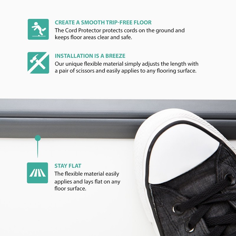 This compact, single-channel cord protector protects cords on the ground and keeps floor areas clear and safe. Our unique flexible material makes installation a breeze and easily applies and lays flat on any flooring surface. No more tripping on loose cords across the floor. Includes double sided adhesive tape.
